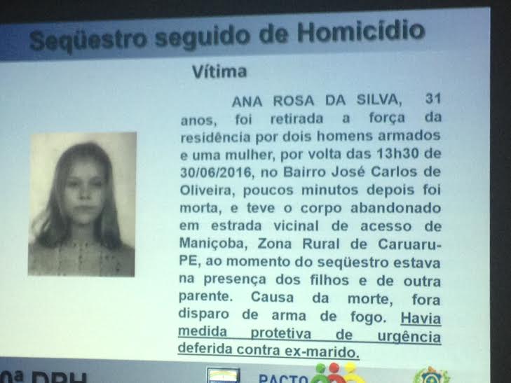 Um sequestro seguido de homicídio ocorreu em Caruaru na tarde dessa quinta-feira (30), foi desvendado pela polícia, que realizou um coletiva de imprensa para esclarecer os fatos. Segundo a polícia, a dona de casa Ana Rosa da Silva, 31 anos, estava em sua residência no bairro José Carlos de Oliveira, quando foi sequestrada às 13h20 e levada para a estrada de Xique-Xique, zona rural do município, sendo assassinada em seguida com três disparos de revólver calibre 38 na cabeça.