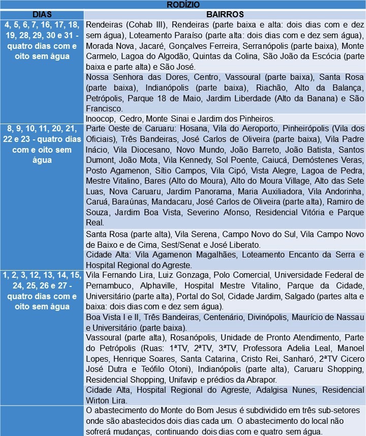 A Companhia Pernambucana de Saneamento (Compesa), divulgou o calendário do rodízio de abastecimento de água para o mês de julho em Caruaru. O cronograma é dividido em três grupos que obedecem ao rodízio de quatro dias com água e oito sem. O abastecimento pode variar de um a quatro dias com água nas localidades.