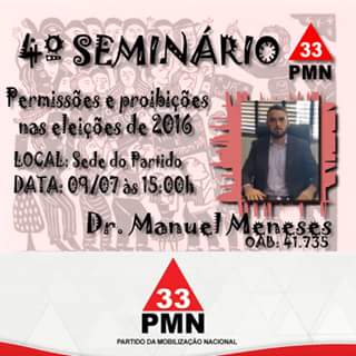 O Partido da Mobilização Nacional (PMN), promove neste sábado (09), mais um importante debate para os filiados da sigla, a partir de 15h, os filiados vão receber as orientações jurídicas do que podem fazer durante o período eleitoral. A palestra será do advogado Manuel Meneses e será realizada na sede do partido, que fica localizado na rua Cônego Júlio de Melo, ao lado da Praça da Criança, centro de Caruaru. Vão participar do evento os pré-candidatos do PMN, segundo o pré-candidato a prefeito de Caruaru, Eduardo Mendonça, presidente do Diretório Municipal do PMN.