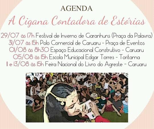A Cigana Contadora de Estórias, é interpretada pela escritora e jornalista Gabriela Kopinits. Se apresentou nesta sexta-feira (29), no Festival de Inverno de Garanhuns (FIG), e neste domingo (31), vai se apresentar no Polo Comercial de Caruaru, veja a agenda de apresentações da artista, que conta as estórias do livro “Era uma vez…. estórias de uma contadora de estórias”, da própria autora, da Cepe Editora. Levando à criançada histórias engraçadas e divertidas.