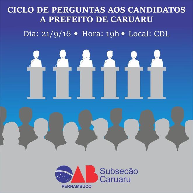 OAB/Caruaru promove Ciclo de Perguntas com candidatos a prefeito de Caruaru, nesta quarta-feira (21), a partir das 19h, no auditório da CDL. O objetivo é conhecer as propostas do próximo gestor municipal. Os postulantes à Prefeitura irão responder perguntas previamente elaboradas pelas Comissões que compõem a Subseção, com temas relevantes, de interesse da Advocacia e da sociedade.