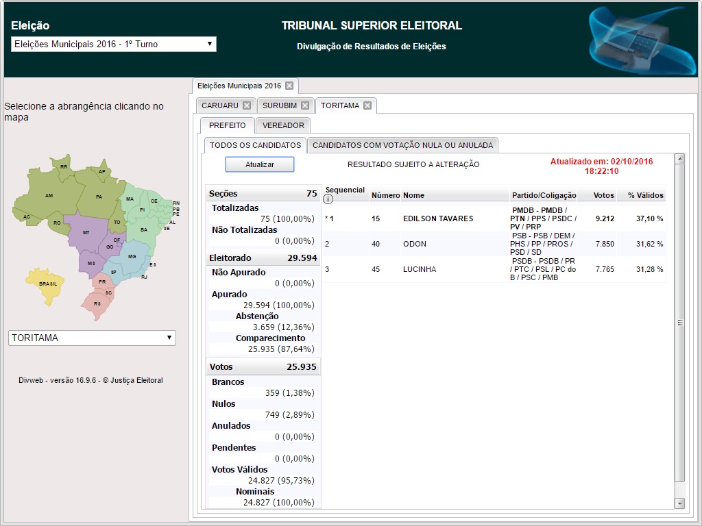 Toritama tem prefeito eleito 2 de outubro de 2016 0 Por blogem Edilson Tavares (PMDB) é eleito em Toritama. Ana Célia é eleita Prefeita de Surubim Santa Cruz do Capibaribe já tem prefeito definido