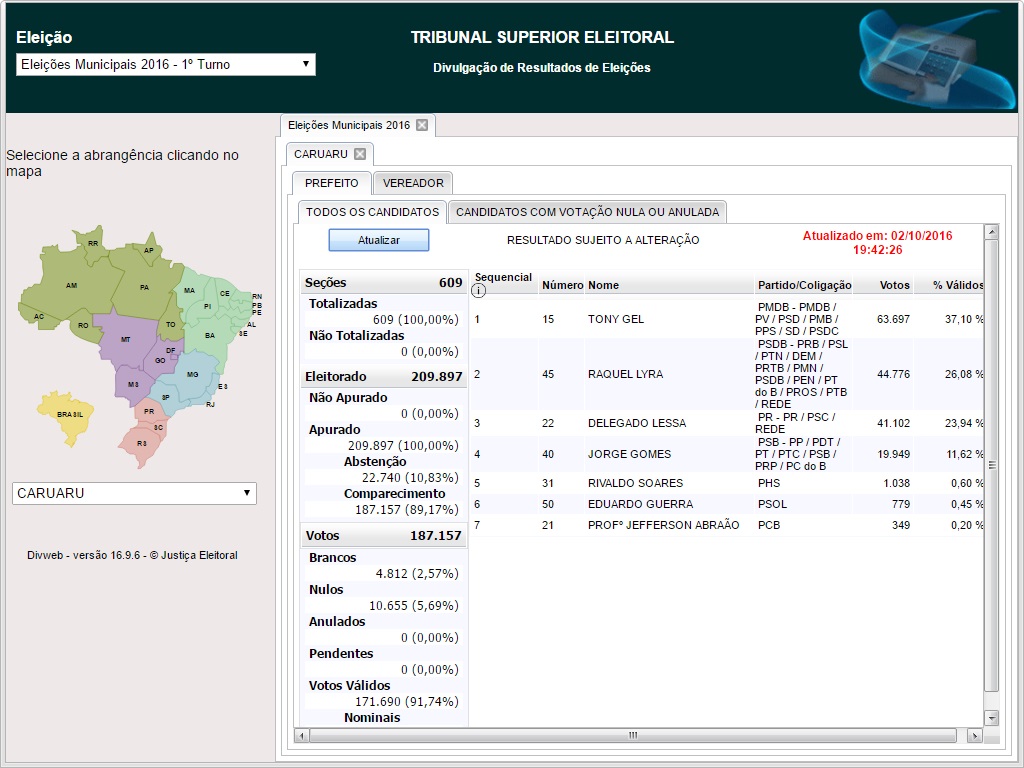 Com esse resultado, passaram para o segundo turno, os candidatos Tony Gel e Raquel Lyra.