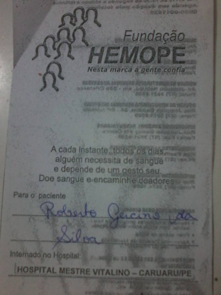 “Solicito aos amigos que possam fazer doação de sangue em meu nome, podendo ser qualquer tipo sanguinio, estarei mim submetendo a uma simples cirurgia no dia 26/10 e precisamos fortalecer o banco de sangue do Hemope ,fica aqui os meus agradecimentos. Nome:Roberto Gercino da Silva, Hospital Mestre Vitalino”.