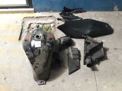 Cinco motocicletas, várias placas e um tanque de combustível de moto