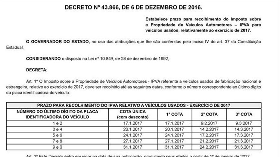 O Governo de Pernambuco publicou um decreto na edição desta quarta-feira (07) do Diário Oficial que dispõe sobre o Imposto sobre a Propriedade de Veículos Automotores (IPVA) de 2017, relativo a veículos usados. De acordo com as informações o decreto, a primeira cota do IPVA passa a ser cobrada já em janeiro.