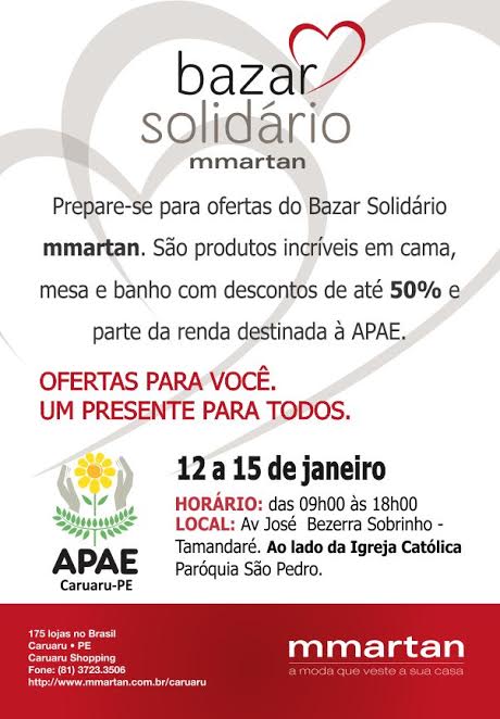 A Apae Caruaru promove em parceria com uma das maiores empresas de cama, mesa e banho do Brasil, a MMartan, um bazar solidário, os produtos estarão com até 50% de desconto e parte da renda será revertida para a Apae de Caruaru.