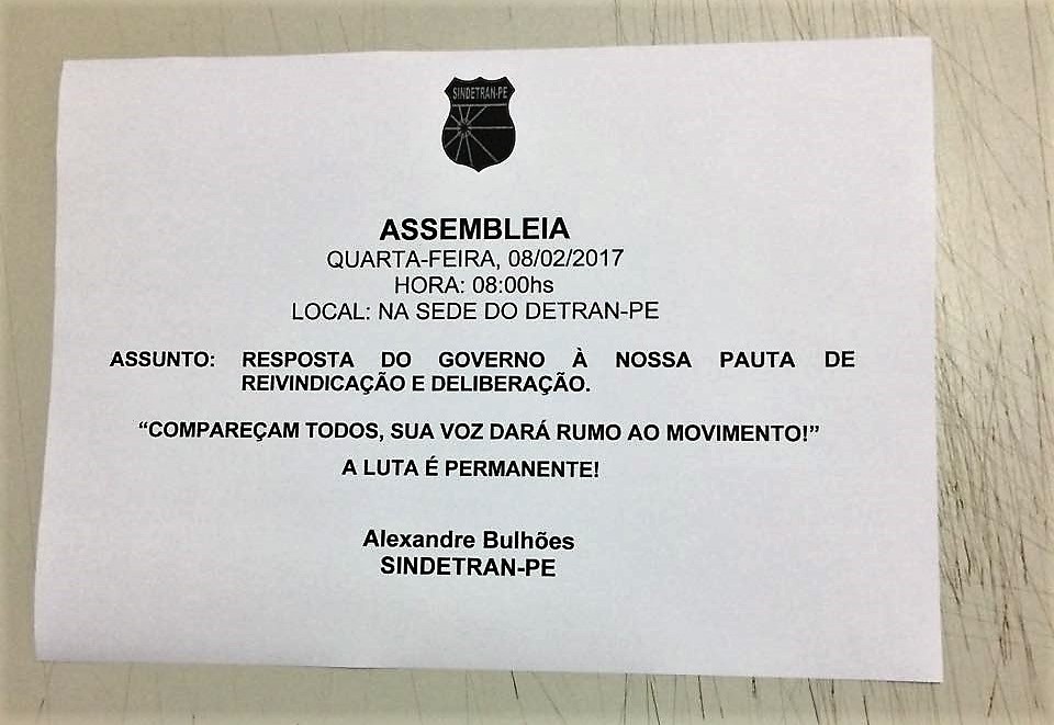 O Departamento Estadual de Trânsito de Pernambuco (DETRAN-PE) paralisará suas atividades temporariamente nesta quarta-feira (08), das 08 as 11h, para realização de uma Assembléia, na sede do Detran-PE, com isto, só após às 11h é que haverá atendimento ao público nas Ciretrans e Postos do Detran-Pe.