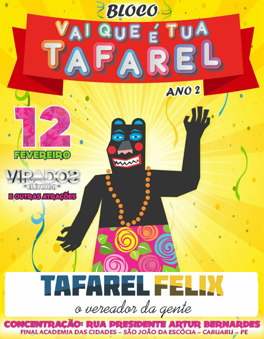 A alegria e a diversão tomarão conta de Caruaru no próximo domingo, 12, com a realização do Bloco “Vai Que É Tua Tafarel”, nos bairros São João da Escócia e Salgado. Pelo segundo ano, a prévia carnavalesca que é realizada pelo vereador Tafarel Felix (PRP), vai arrastar uma multidão ao som de muita música, e claro, símbolos do carnaval pernambucano.