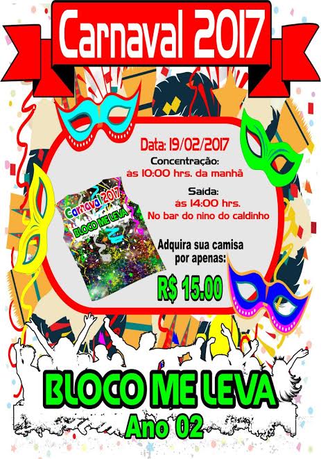 No próximo domingo 919), desfila em Caruaru, o Bloco Me Leva ano 2. A concentração será às 10h da manhã, no bar do Nino do Caldinho, no bairro do Salgado, e a saída será às 14h, Os patrocinadores terão direito a duas camisetas, haverá policiamento ao longo do percusso e serão distribuídos gratuitamente 100 litros de batida para os foliões, com animação de Orquestra de Frevo.