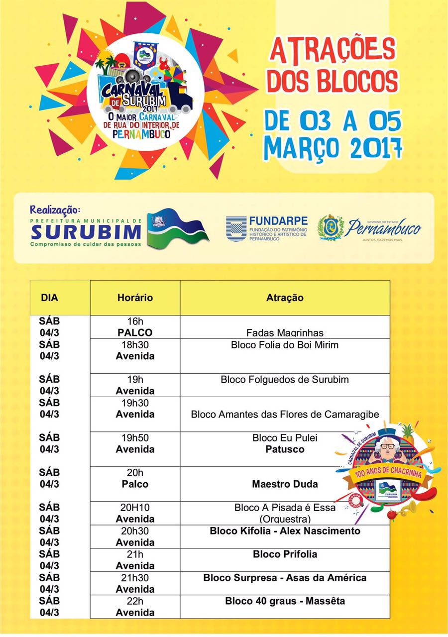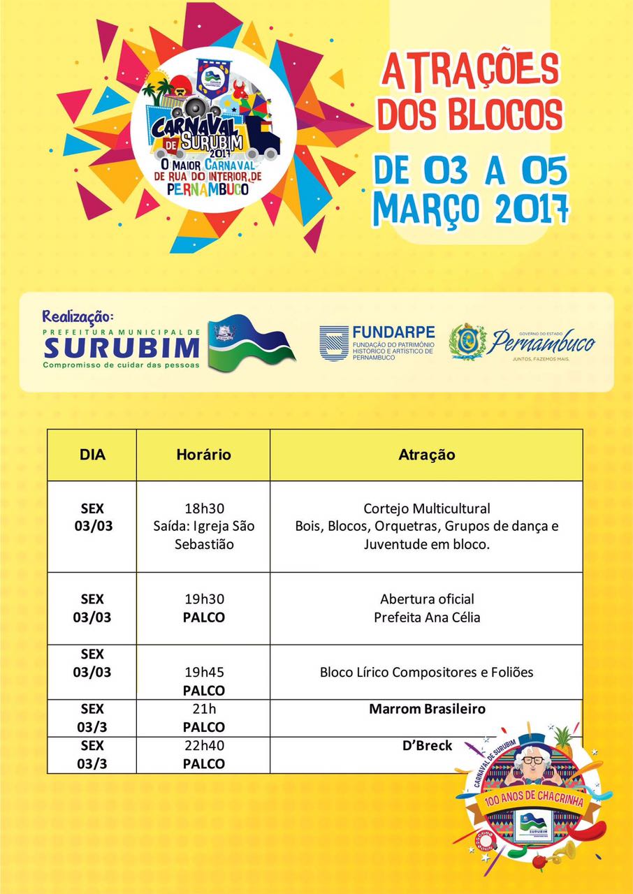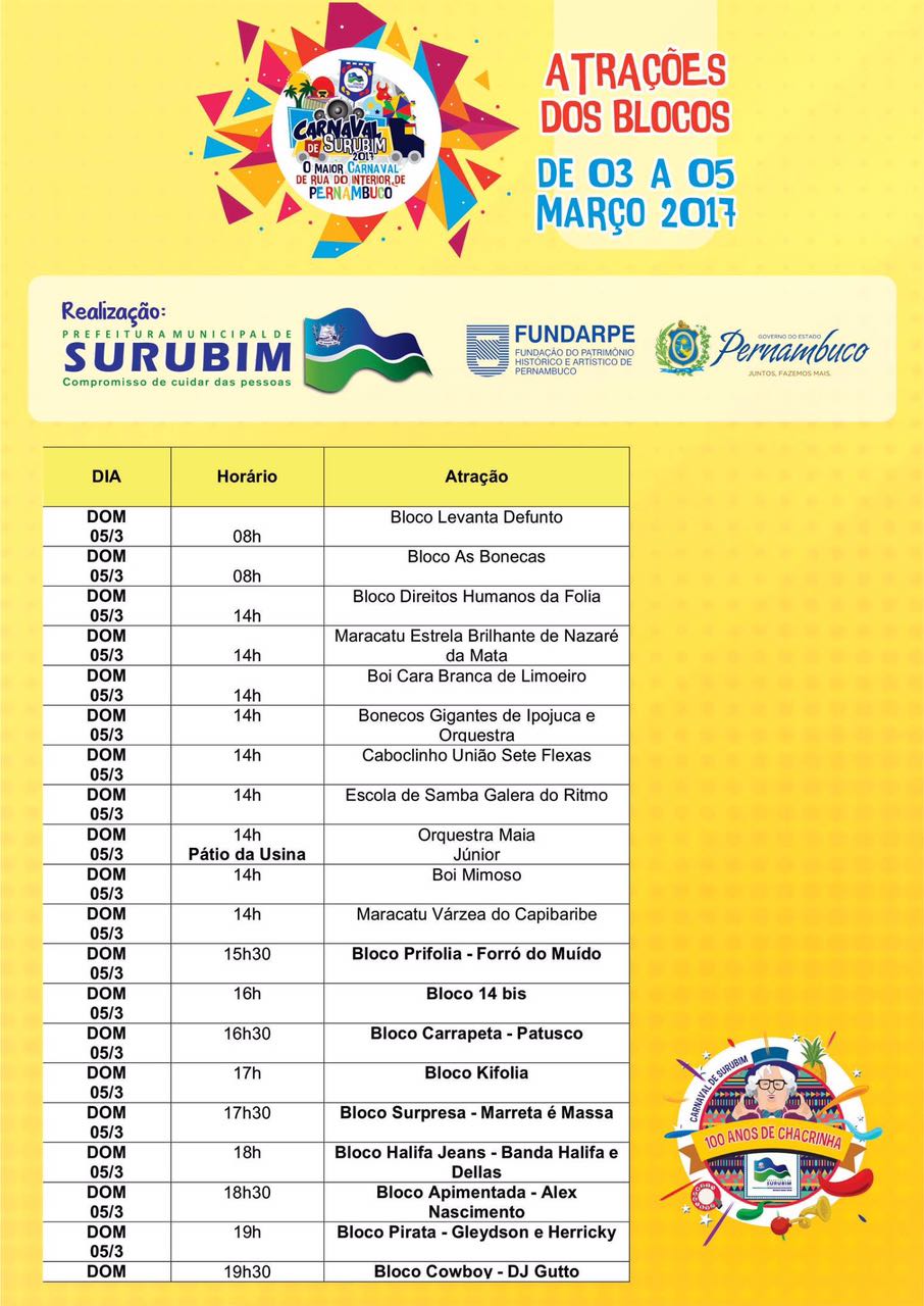 Confira a programação do carnaval de Surubim neste fim de semana 2 de março de 2017 0 Por blogem Homem assassinado na porta da própria residência em Caruaru Grave acidente com vítimas fatais em Cupira nesta quinta (2)