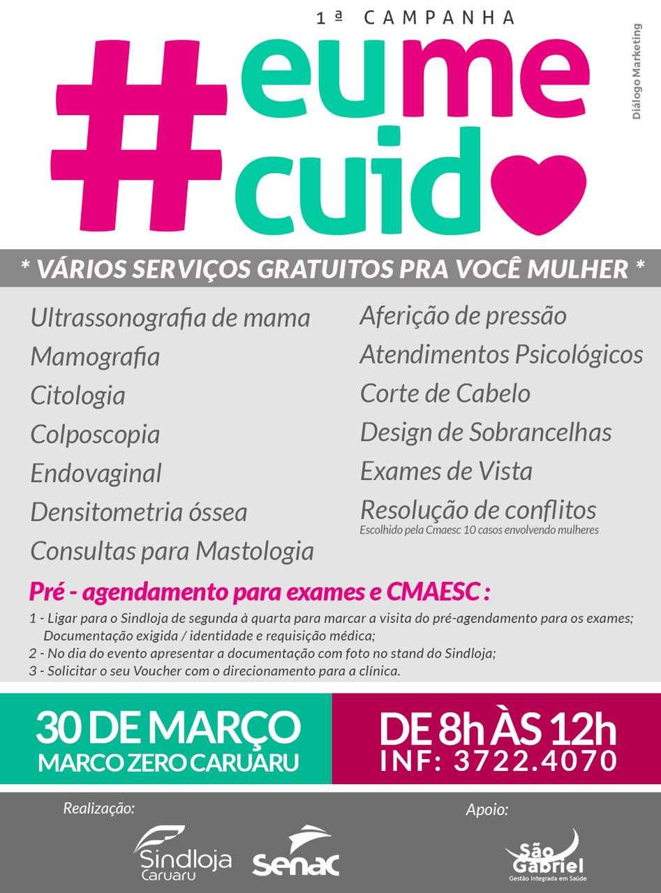 Para homenagear o público feminino neste mês da mulher, o Sindicato dos Lojistas do Comércio de Caruaru e a unidade do Senac promovem, no dia 30 de março, de 8h às 12h, a 1ª Campanha #eumecuido, em parceria com a Clínica São Gabriel. O evento vai oferecer diversas ações sociais gratuitas no Marco Zero da cidade, com atividades em prol da beleza, da saúde e do bem-estar feminino.