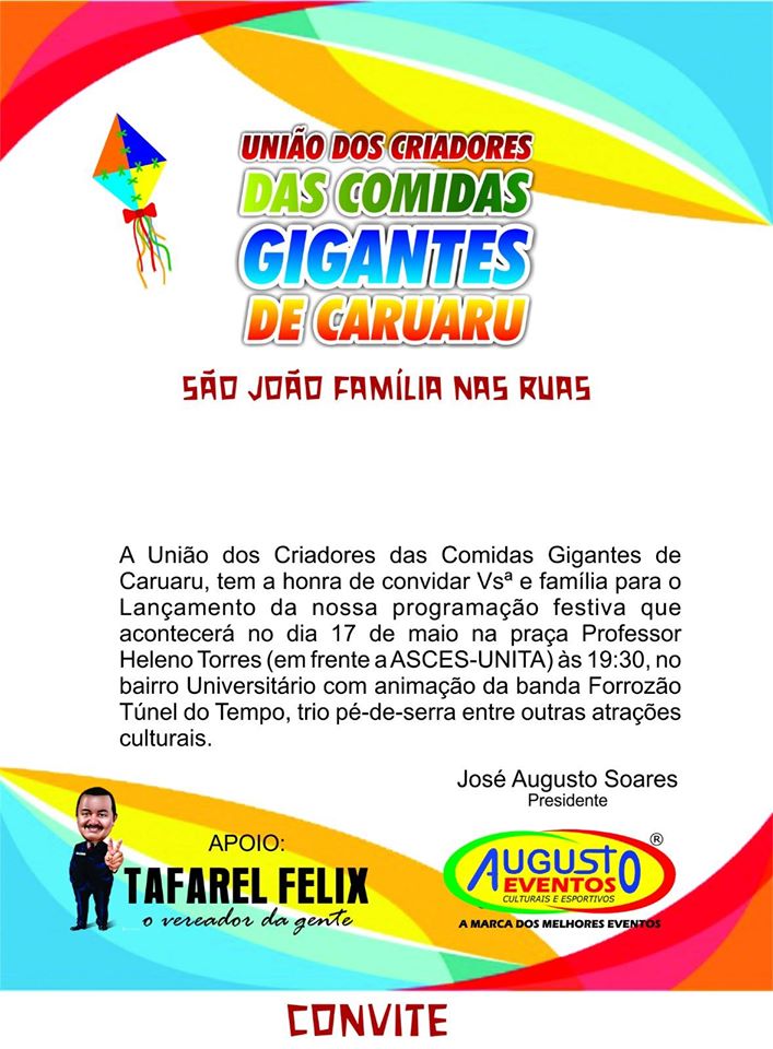 A União das Comidas Gigantes de Caruaru fará o lançamento oficial da programação no dia 17 de maio, véspera do aniversário da cidade. O evento será realizado na Praça Professor Heleno Torres, em frente a Asces-Unita, na avenida Portugal, no bairro Universitário, a partir das 19h. Nesta quarta-feira (26) será realizada uma reunião entre os membros da União, na Acaccil, às 19h, onde o presidente da União, Augusto Eventos, vai tratar sobre importantes assuntos referentes não só ao lançamento, como também todas as festas que serão realizadas no mês de junho pela União das Comidas.