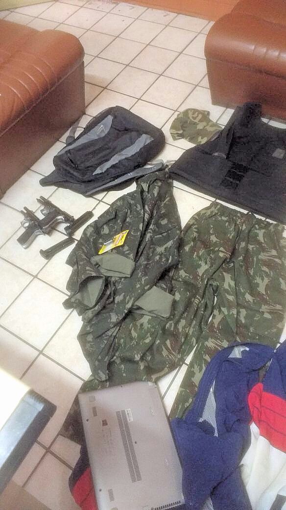casa, em seguida os policiais revistaram o interior da residência, encontrando 01 colete, gandolas do exército e 03 bananas de emulsão TNT (dinamite), ao