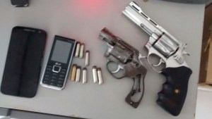 encontrados dois revólveres calibre 38, oito munições e uma porção de maconha.