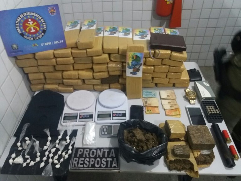 Com a dupla, foram apreendidos 63 quilos de maconha e 38 bolsas com cocaína, um carro clonado, 14 munições calibre 38, duas munições calibre 12, três balanças de precisão, um silenciador de submetralhadora, um relógio, quatro celulares e 1.847 reais.