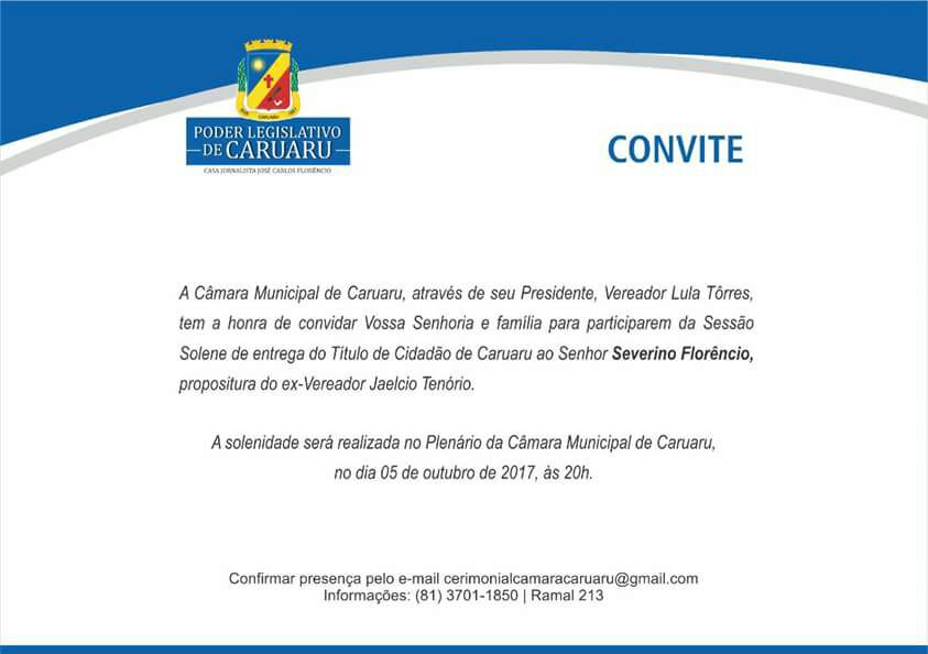 A Câmara de Vereadores de Caruaru entrega o Título de “Cidadão Caruaruense” ao ator Severino Florêncio, em Sessão Solene, às 20h desta quinta-feira (05). A propositura é do ex-vereador Jaelcio Tenório.