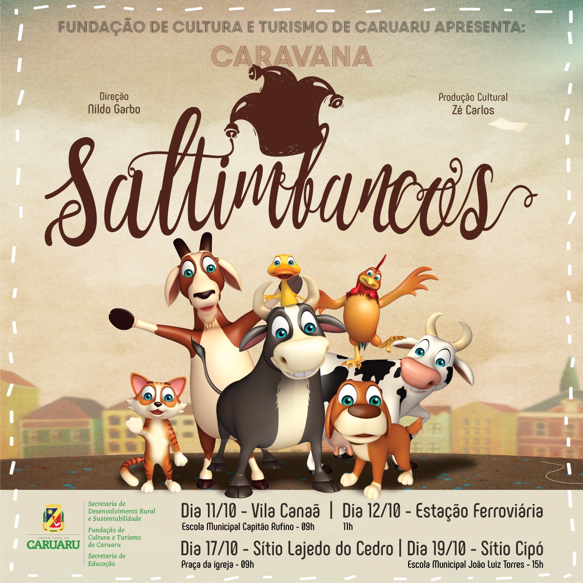 Nesta quarta (11), a Caravana Saltimbancos chega à Escola Municipal Capitão Rufino, na Vila Canaã, no 2º distrito, a partir das 9h. Dirigida por Nildo Garbo e com produção cultural de Zé Carlos, a peça tem duração de 40 minutos. As próximas comunidades a receber a caravana são o Sítio Lajedo do Cedro, no dia 17 de outubro, e Sítio Cipó, no dia 19. Além da zona rural, a peça será encenada na Estação Ferroviária, no dia 12 de outubro, em comemoração ao Dia das Crianças.