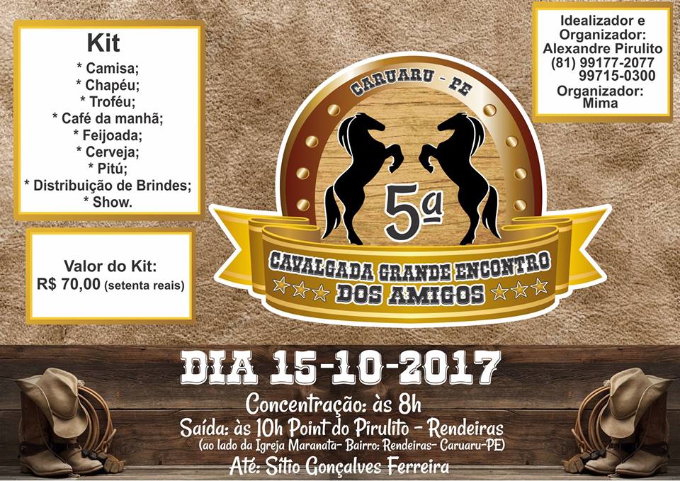 Será realizada no próximo domingo (15) a 5ª Cavalgada Grande Encontro dos Amigos. A concentração vai acontecer a partir das 8h da manhã no bairro Rendeiras. As atrações são Ivanildo Aboiador, Jorge Madalena, Rubinho Show e Carlla Moura.