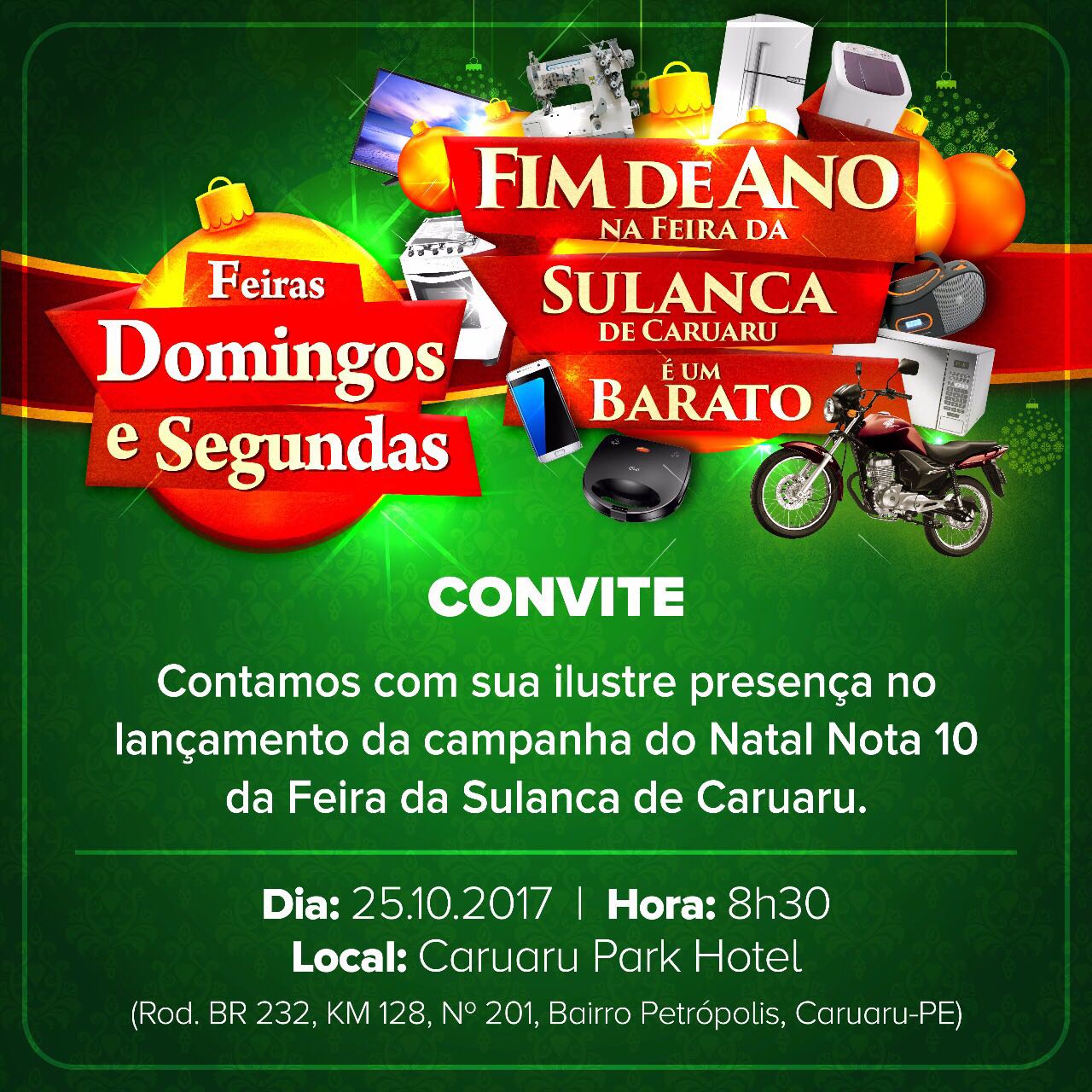 Com a finalidade de alavancar as vendas do fim do ano, a campanha ‘Natal Nota 10 da Feira da Sulanca” será lançada, na próxima quarta-feira (25), às 8h30, durante um café da manhã no Caruaru Park Hotel. Com a campanha, a Feira da Sulanca será divulgada em seis estados do Nordeste.