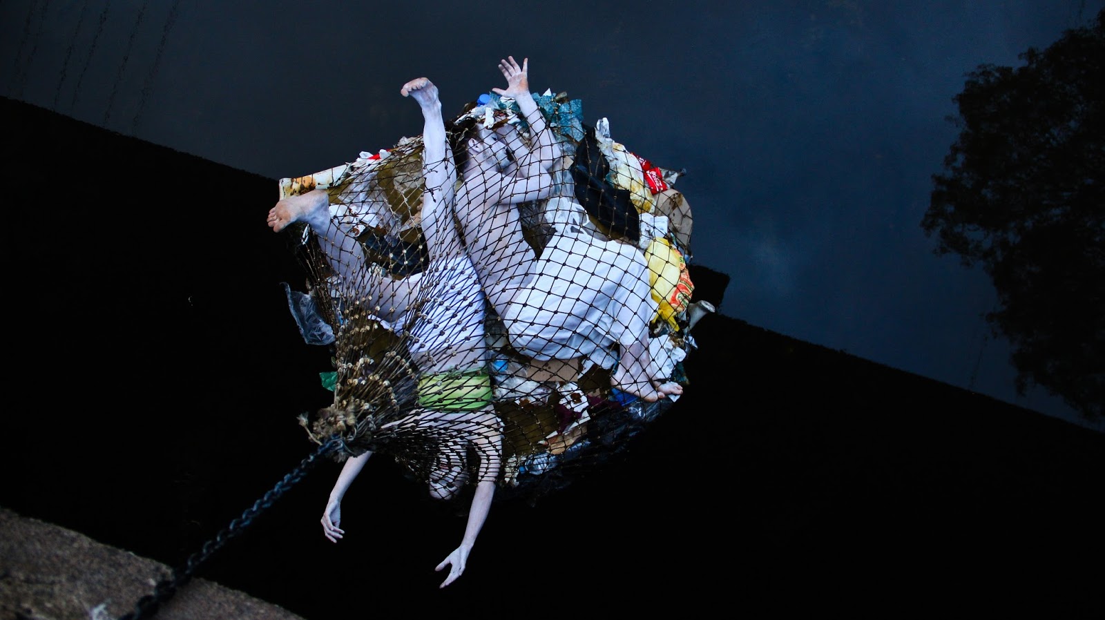 os performers vão ficar dentro de uma rede de lixo. O intuito é chamar a