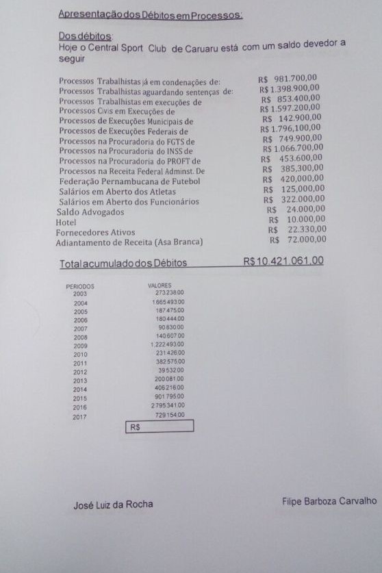 Em coletiva realizada nesta terça-feira (24) na sede do Central a direção anunciou o passivo do clube. De acordo com o presidente da entidade, Clovis Lucena, os débitos passam da ordem de R$ 10 milhões. Grande parte dessa dívida diz respeito à causas trabalhistas, herdarás de várias gestões que não tiveram planejamento e deixaram as dívidas.