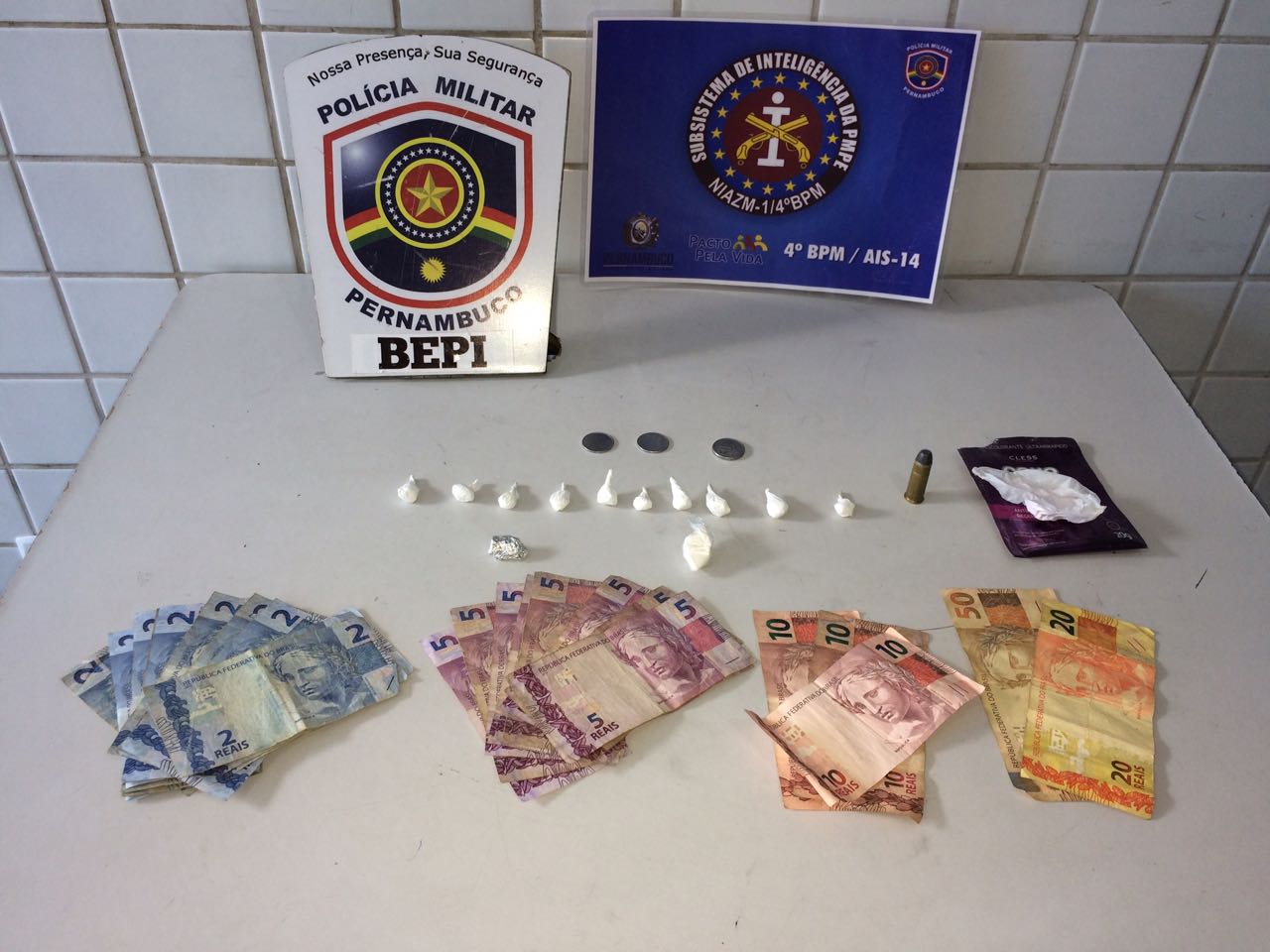 Segundo a polícia, a quantia de R$ 190,50 em cédulas trocadas provenientes da prática de tráfico de entorpecentes. O imputado, foi encaminhado para a 14ª DESEC, onde foi apresentado ao delegado plantonista e autuado em flagrante por tráfico de drogas e será apresentado à audiência de custódia.