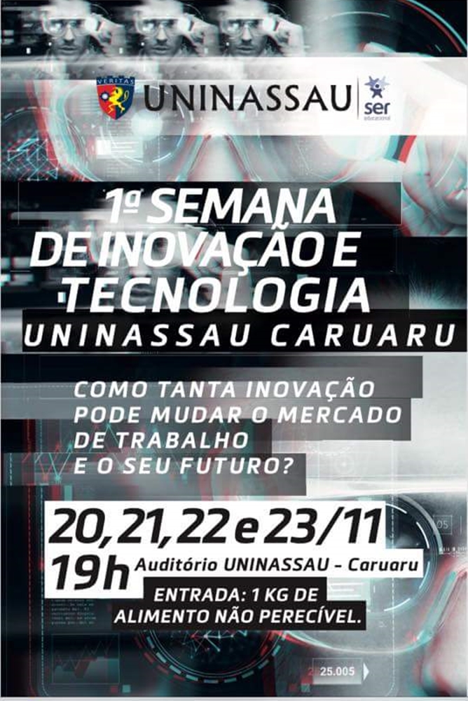 A Faculdade UNINASSAU Caruaru realiza, entre os dias 20 e 23 de novembro, a 1ª Semana de Inovação e Tecnologia, que debaterá o tema ‘’Caruaru no cenário tecnológico’’. O evento será realizado pelos cursos tecnólogos de Análise e Desenvolvimento de Sistemas, Marketing e Design de Interiores, no horário das 19h às 22h, no auditório e em salas de aula da instituição. Além de alunos, o evento é voltado para pessoas interessadas nos temas que serão abordados nas atividades. As inscrições gratuitas podem ser feitas pelo site da UNINASSAU. Os participantes devem levar um quilo de alimento não-perecível.