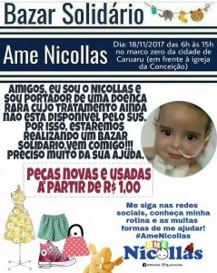 Neste sábado (18) será realizado um bazar para arrecadar dinheiro para o tratamento do garoto Nichollas. O evento vai acontecer a partir de 8h no Marco Zero e contando com apoio de voluntários, parentes e amigos da família. Nichollas foi diagnosticado com Amiotrofia Muscular Espinhal (AME) tipo 1 aos seis meses de idade, e em breve vai completar dois anos de idade.