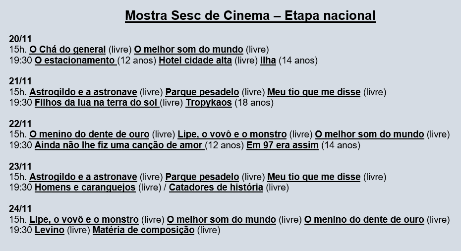 Mostra Sesc de Cinema – Etapa Nacional em Caruaru a partir desta segunda (20) 20 de novembro de 2017 0 Por blogem Mostra Sesc de Cinema – etapa nacional – de 20 a 24 de novembro com exibições no teatro Rui Limeira Rosal às 15h para o público infanto-juvenil e às 19:30 para o público adulto. A entrada será gratuita durante toda a programação. Empresário Tonynho Rodrigues visita comunidades na zona rural de Caruaru CIRETRAN e Lei Seca querem intensificar Educação no Trânsito nas Escolas