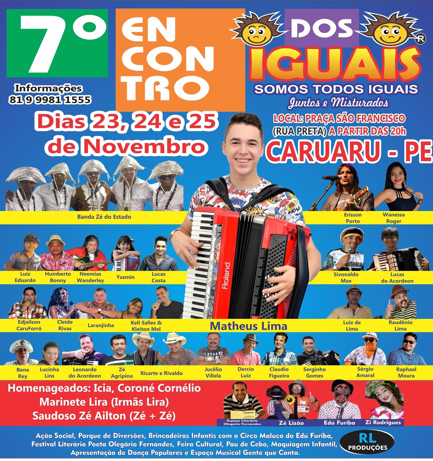 A partir de hoje (23), a população caruaruense se reunirá para valorizar a igualdade, a fraternidade e o amor ao próximo no 7º Encontro dos Iguais. O evento, que sempre proporciona a produção local e divulga o bairro e a cidade para visitantes e turistas que vêm de diversos estados, continuará até o sábado (25) e contará com shows culturais, feirinhas típicas, dança, banda da Polícia Militar, festival literário com o poeta Olegário Fernandes, parque de diversões, animações para as crianças com o circo Edu Furiba.