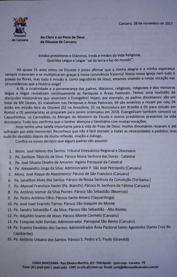 Relação dos Padre nomeados e transferidos pela Diocese de Caruaru: