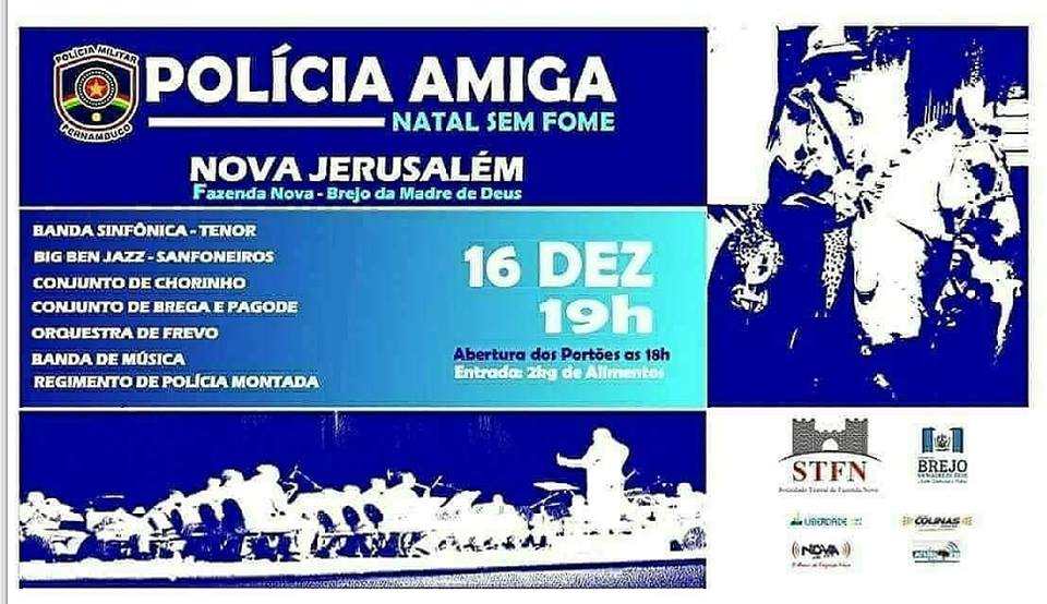 Será realizado neste sábado (16), no Fórum de Pilatos do maior teatro ao ar livre do mundo, localizado no Distrito Eco-Turístico de Fazenda Nova, Brejo da Madre de Deus, Pernambuco, o Espetáculo Musical Polícia Amiga em Natal sem Fome, promovido pela Polícia Militar de Pernambuco, em parceria com a Sociedade Teatral de Fazenda Nova. Os portões serão abertos às 18h e o espetáculo terá início às 19h.