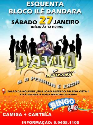 No próximo sábado dia 27, a partir das 12h, no Salão da Kolping, na rua João Alfredo, no bairro Boa Vista (por trás da Igreja de Nossa Senhora de Fátima), haverá o Esquenta Bloco Ilê Dandara, antecedendo o desfile. É uma forma de congraçamento entre os participantes do bloco e também para venda das camisas, cuja entrada para o “ESQUENTA ILÊ DANDARA” é a compra da camisa, ao preço de R$ 20,00. Será um clima de alto astral e ao som de “DAVID CAVACO E BANDA”.