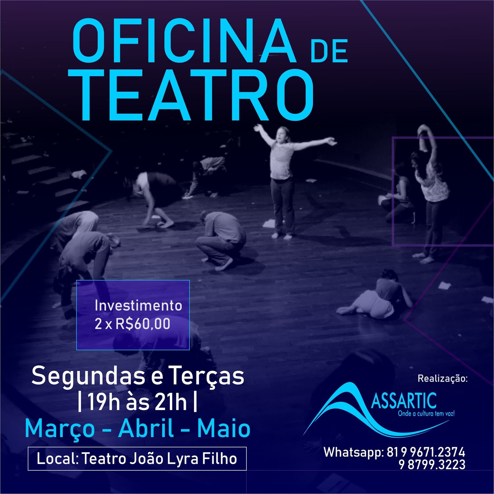 O Teatro João Lyra Filho abre inscrições para oficina de teatro. Com duração de 03 meses com aulas nas segundas e terças (19h – 21h), a oficina tem início programado para o mês de março. As vagas estão abertas a partir da quarta (31) e, para participar, não é exigida experiência do interessado.