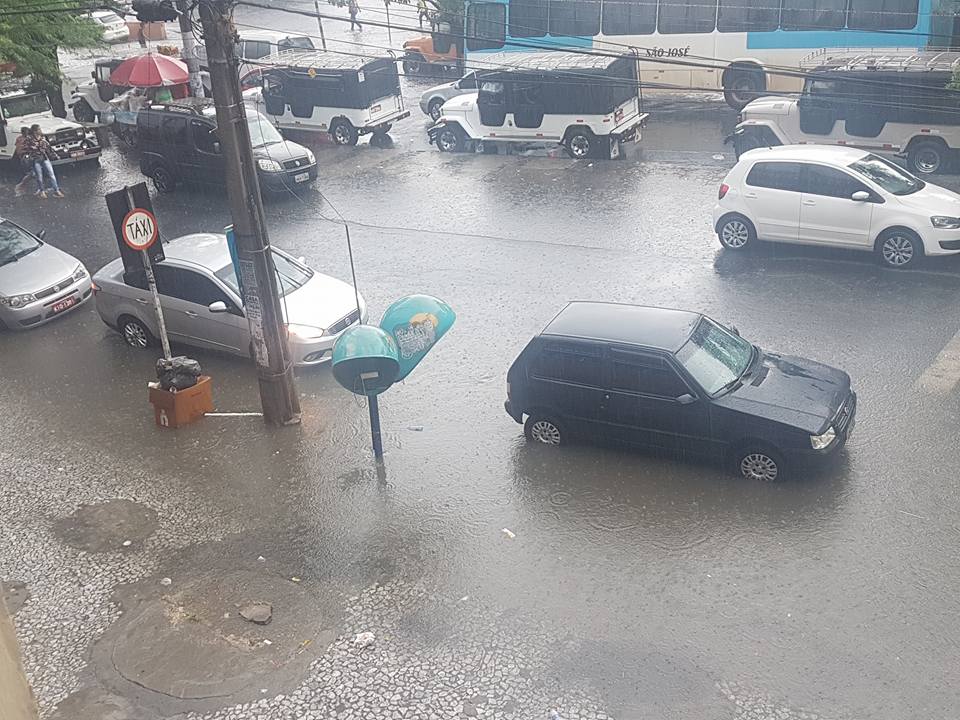 A rua São Sebastião, no centro comercial, ficou alagada. Sem escoamento, a água invadiu várias lojas.