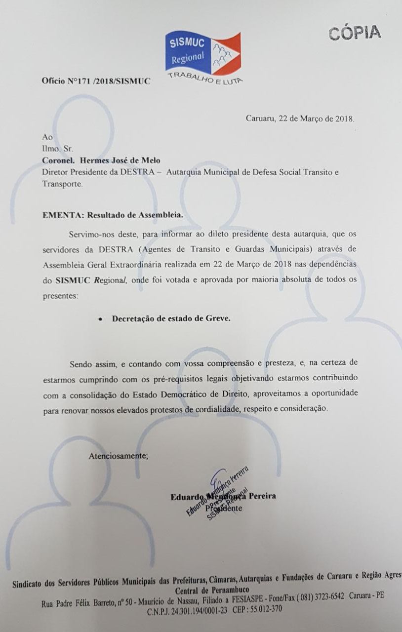 Na ocasião, o Presidente Eduardo Mendonça fez aos Servidores, a leitura da ata da Reunião, ocorrida com a Prefeitura de Caruaru, onde Secretário da Fazenda, Diogo Bezerra informou que as verbas do Município são unificadas para fins de contabilização, o que impede um reajuste imediato, e pediu mais 15 dias para avaliar um possível reajuste salarial.