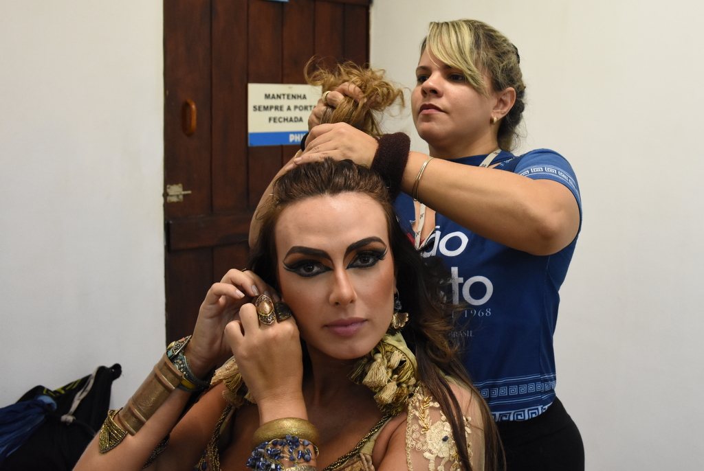 Para encarnar a rainha Herodíades na 51ª edição da Paixão de Cristo de Nova Jerusalém, Nicole Bahls fica sob os cuidados de Tabyra Mariz e Eline Soares maquiadores do espetáculo.