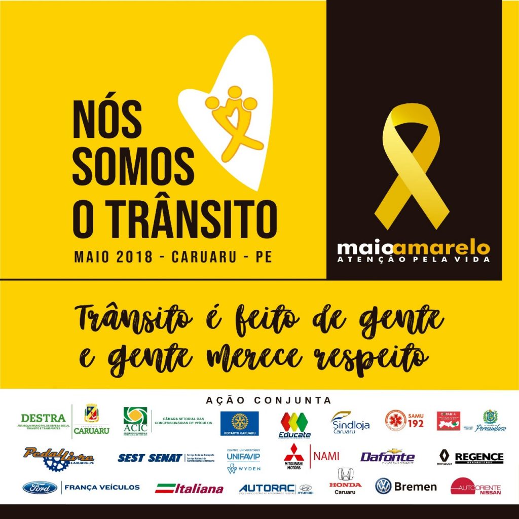 Durante todo o mês de maio serão promovidas, em Caruaru, ações conjuntas sobre segurança no trânsito. O poder público e a sociedade civil organizada se reúnem, pelo terceiro ano consecutivo, para promover ações em alusão ao “Maio Amarelo”. O movimento, que este ano traz como tema “Nós Somos o Trânsito”, tem a proposta de chamar atenção da sociedade para o alto índice de mortes e feridos em todo o mundo. Por essa razão, foi produzida, para todo o mês de maio, uma programação que reúne ações educativas de trânsito em ruas e avenidas da Cidade, simulação de acidente de trânsito; serviços gratuitos de saúde; atividades lúdicas com arte-educadores em escolas; mobilização de respeito a vagas de estacionamento para pessoas com deficiência e palestras em empresas e para a sociedade em geral.