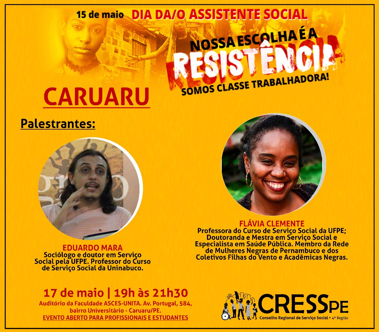 Para esse evento, estarão fazendo o debate o sociólogo e professor da Uninabuco, Eduardo Mara, que estará falando sobre a atual conjuntura do país e Flávia Clemente, professora do Curso de Serviço Social da UFPE, que falará sobre o tema da campanha do Conjunto CFESS/CRESS: “Nossa escolha é a resistência: somos classe trabalhadora”.