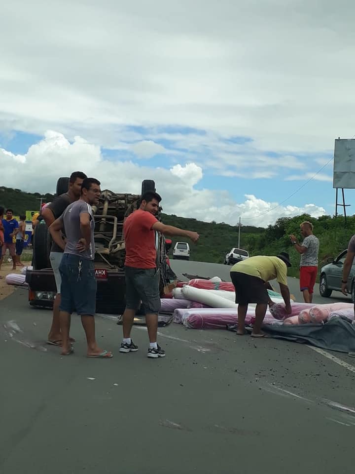 Um veículo D20 de placas KHV-4179 carregado de tecidos, capotou na manhã desta sexta-feira (18), na PE-160, em Santa Cruz do Capibaribe. Segundo informações um pneu dianteiro estourou e causou o acidente, mas ninguém se feriu gravemente, apenas algumas escoriações nos dois ocupantes do veículo.