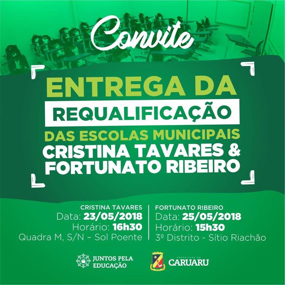 A prefeita de Caruaru, Raquel Lyra, entregará a população mais duas escolas completamente requalificadas. As entregas serão feitas nesta quarta-feira (23), na cidade e na sexta-feira (25), na zona rural.