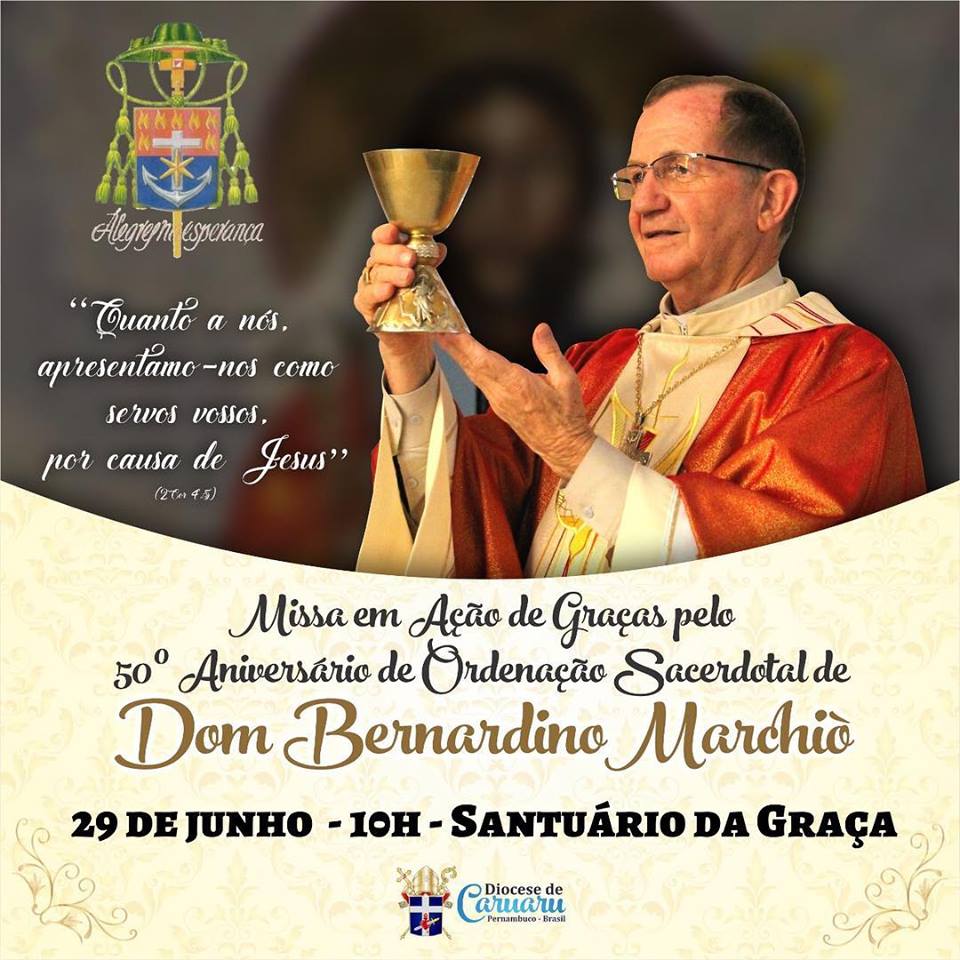 Na próximo sexta-feira (29), a Diocese de Caruaru vai render graças a Deus pelas Bodas de Ouro Sacerdotal do Bispo Diocesano, Dom Bernardino Marchió. O aniversário de 50 anos de Ordenação Sacerdotal de Dom Dino será comemorado com uma Missa em Ação de Graças no Santuário da Graça, às 10h, no bairro Petrópolis.
