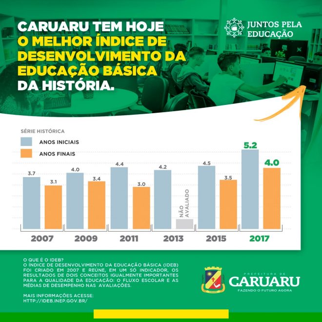 4 de setembro de 2018Em Caruaru, a melhoria no IDEB reflete o grande investimento do Governo Municipal na formação continuada para professores. O investimento foi na ordem de R$ 2 milhões para ampliação e aperfeiçoamento das atividades pedagógicas direcionadas aos estudantes, fazendo uso de metodologias aplicadas nas escolas e creches da rede municipal de ensino. “Esse foi um dos passos primordiais para melhorarmos a proficiência e contrapormos a questão da distorção idade/série que é uma variável importante para chegarmos ao sucesso do Índice de Desenvolvimento da Educação Básica (IDEB)”, explicou o secretário de Educação, Rubenildo Moura.