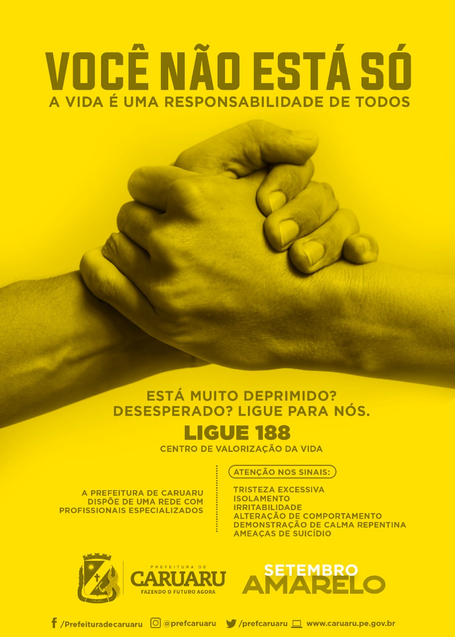 Como parte da programação do Setembro Amarelo, alusivo ao Dia Internacional de Combate e Prevenção ao Suicídio, pontuado na última segunda-feira (10), as secretarias de Desenvolvimento Social e Direitos Humanos, Saúde, Educação e de Política para Mulheres de Caruaru estarão promovendo uma ação de panfletagem nesta sexta-feira (14) no Espaço Major Clementino (ao lado do Grande Hotel). O material a ser distribuído traz informações de alerta e responsabilidade que cada pessoa deve ter com a própria vida e com a vida do próximo.