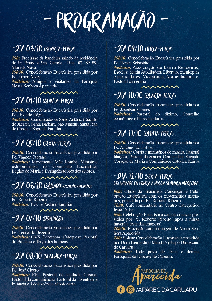 Programação da festa de Nossa Senhora Aparecida no bairro Rendeiras
