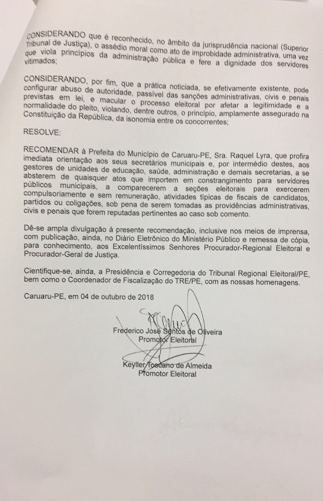 A denúncia foi feita de forma anônima ao MPPE, que orientou por meio do promotores Keiller Toscano e Frederico Oliveira que tal constragimento seja evitado por parte de secretários municipais nas áreas de saúde e educação.