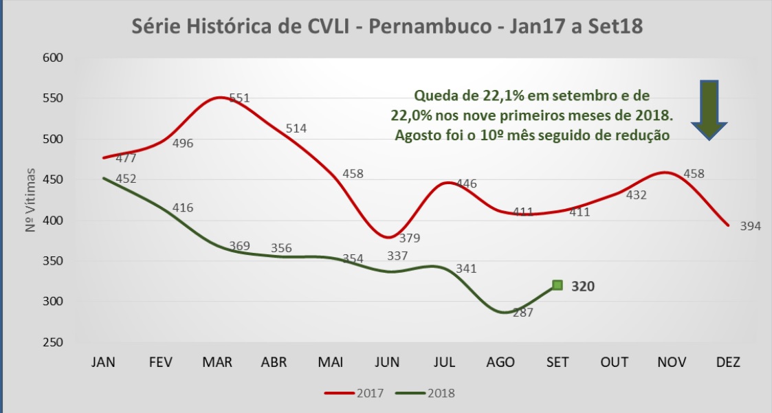 Em setembro de 2018, Pernambuco registrou um total de 320 ocorrências de Crimes Violentos Letais Intencionais (CVLI), o que representa uma redução de 22% em relação a setembro de 2017, quando foram registrados 411 desses crimes. Com isso, o Estado já conta com dez meses consecutivos de redução de homicídios quando se compara com o mesmo período do ano anterior. No consolidado dos nove meses, a redução também chega aos 22%. No total, foram 3.232 homicídios registrados pelas polícias entre os meses de janeiro e setembro de 2018, enquanto no mesmo período do ano passado, haviam sido contabilizadas 4.143 ocorrências.