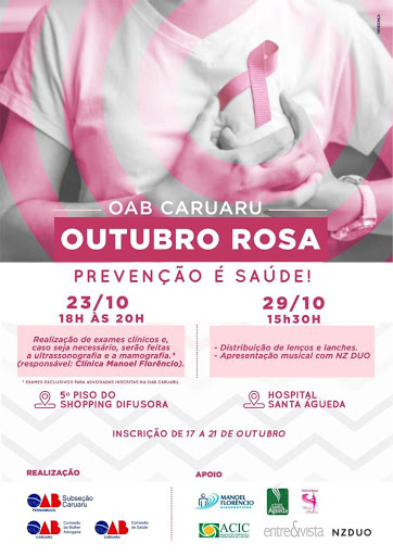As Comissões da Mulher Advogada e Saúde da OAB Caruaru realizam ação de conscientização e prevenção do câncer de mama. O evento, que conta com apoio do médico Manoel Florêncio, será realizado no 5º piso de um Shopping, localizado no bairro Maurício de Nassau, a partir das 18h desta terça-feira (23).