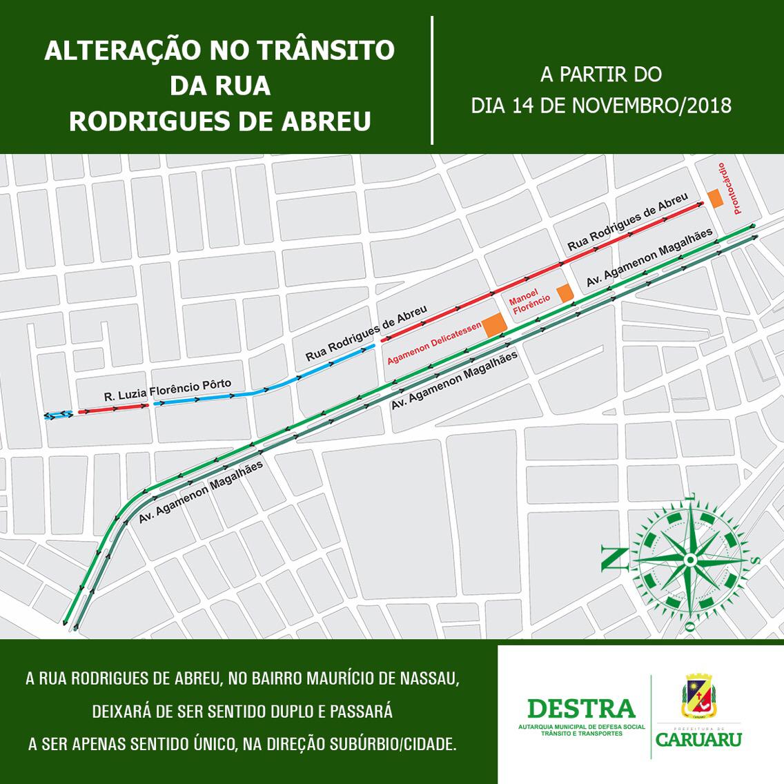 A Autarquia Municipal de Defesa Social, Trânsito e Transportes (Destra) informa que, a partir desta quarta-feira (14), a rua Rodrigues de Abreu, no bairro Maurício de Nassau, deixará de ser sentido duplo e passará a ser apenas sentido único, na direção subúrbio/cidade. A mudança faz parte da primeira fase de requalificação do fluxo viário do bairro Maurício de Nassau. Com a transição, a expectativa é que haja mais fluidez na área, que atualmente conta com grande fluxo de veículos em decorrência da existência de muitos equipamentos públicos e outros de interesse coletivo.